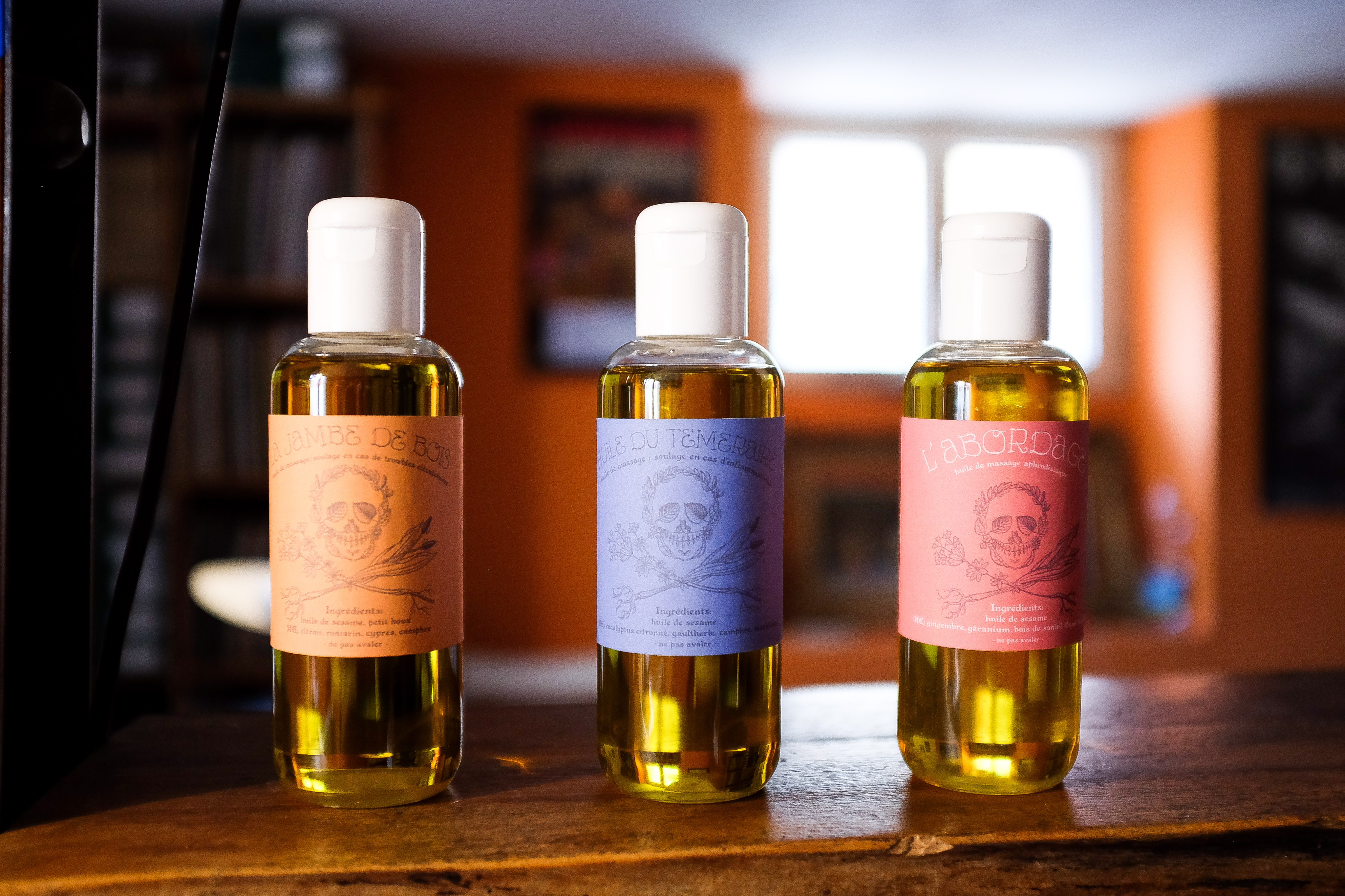 - La jambe de bois: Huile de sésame, petit houx, HE citron, romarin, cyprès, camphre